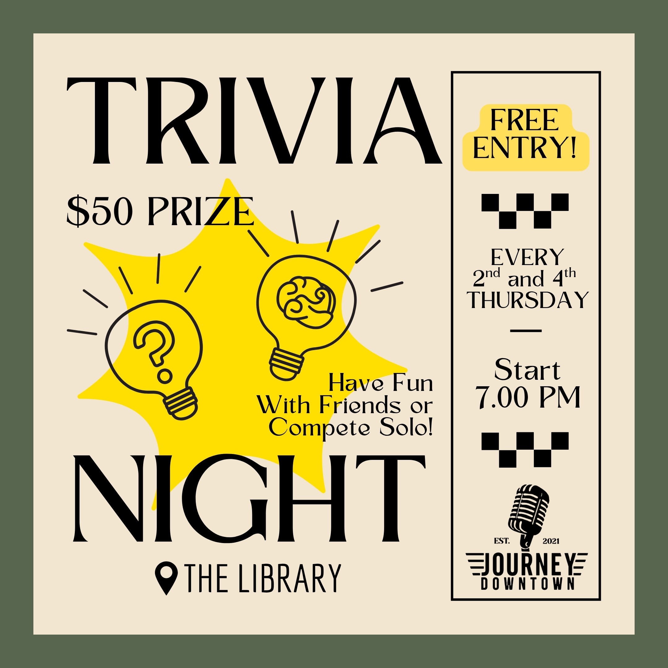 Join Trivia Night in Vacaville at The Library inside Journey Downtown. Bring your team for food, drinks, and competitive trivia, with a $50 gift card prize for first place.